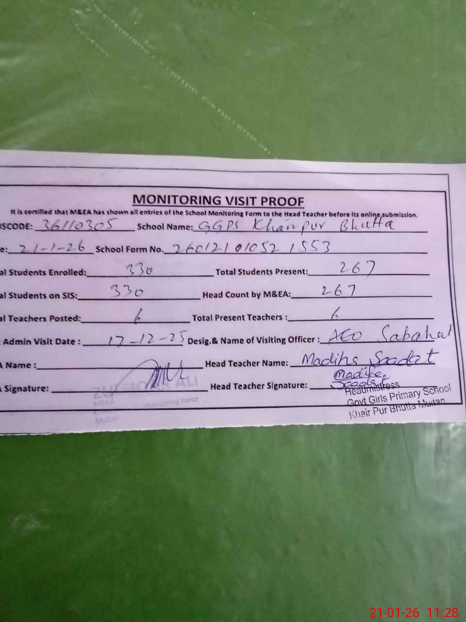| Attendance Register | Head Teacher | MEA with School | Visit Proof |