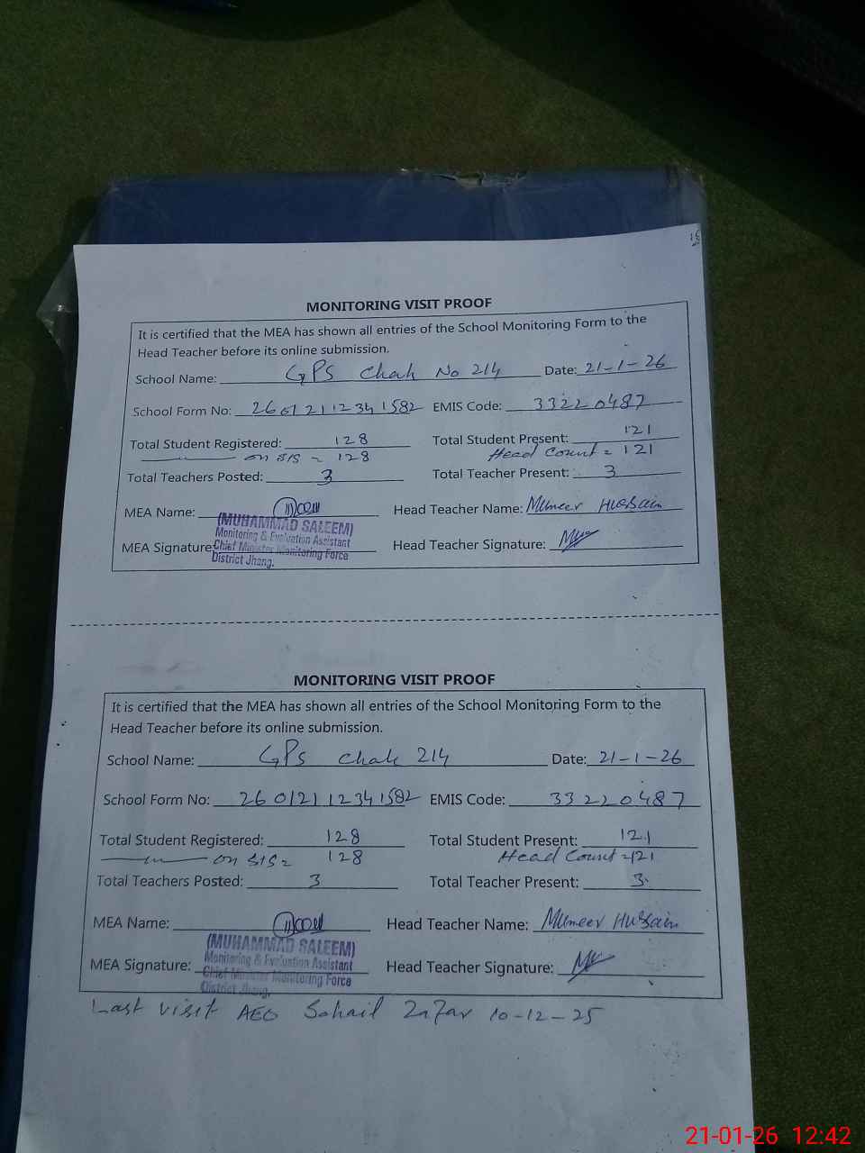 | EMIS Code: 33220487 | Name of School: GPS CHAK NO 214 ABADI JB GUJAR | |||