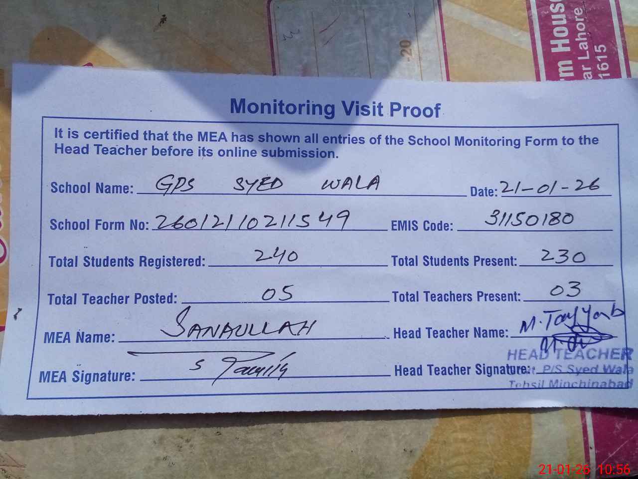 | Attendance Register | Head Teacher | MEA with School | Visit Proof |