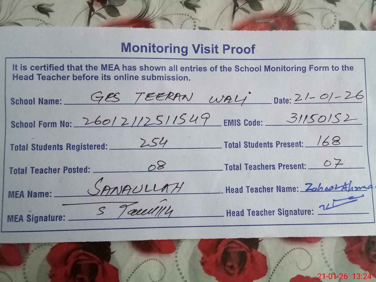 | Attendance Register | Head Teacher | MEA with School | Visit Proof |
