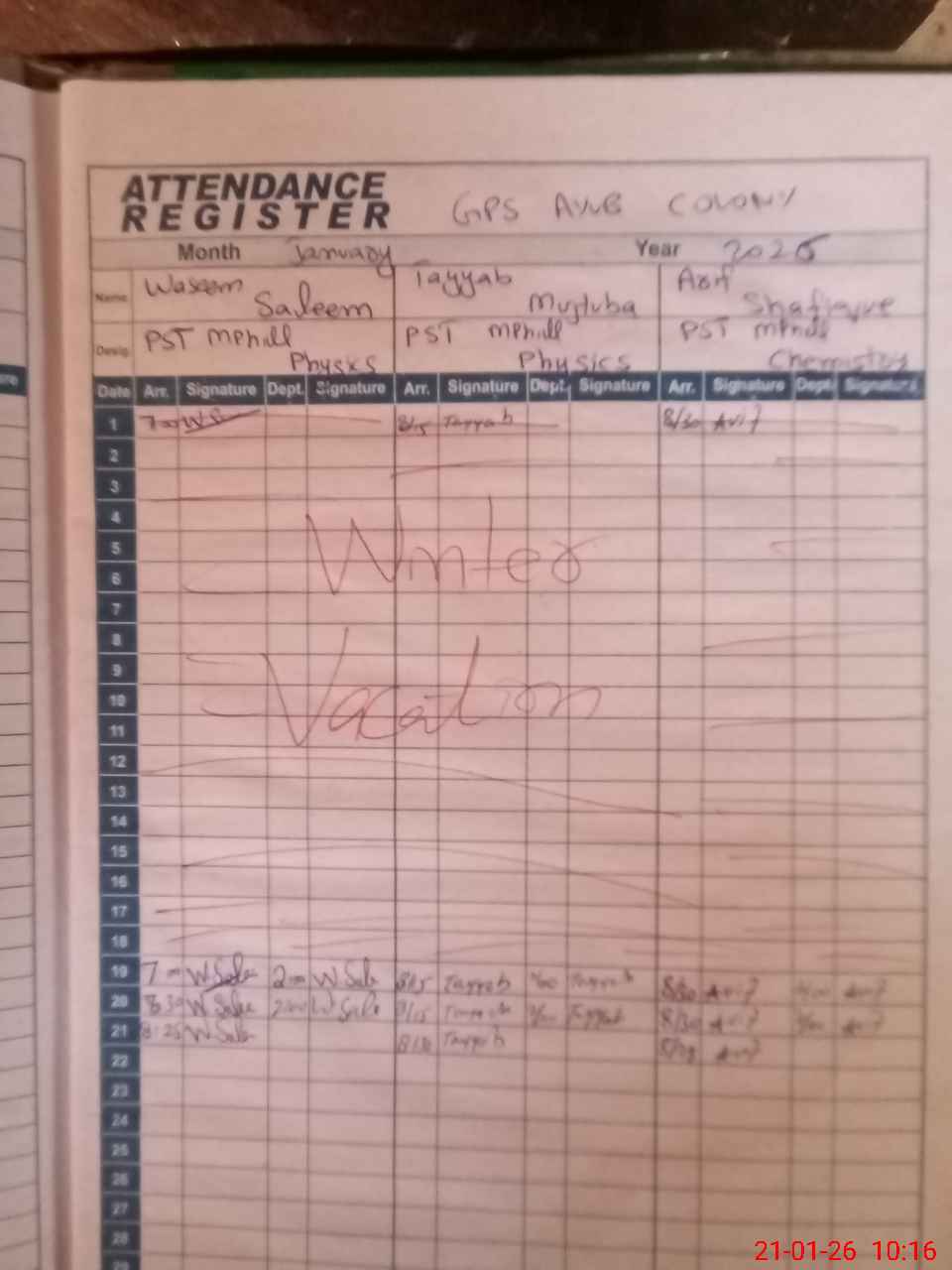 | CNIC | Full Name | Designation | R/C | Absence during last cal. month |