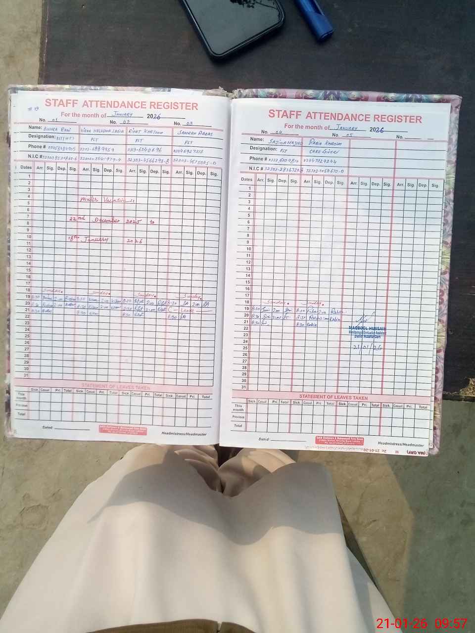 | CNIC | Full Name | Designation | R/C | Absence During Last Calender Month |