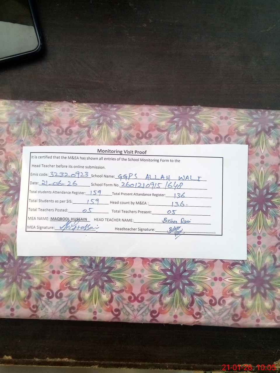 | Attendance Register | Head Teacher | MEA with School | Visit Proof |