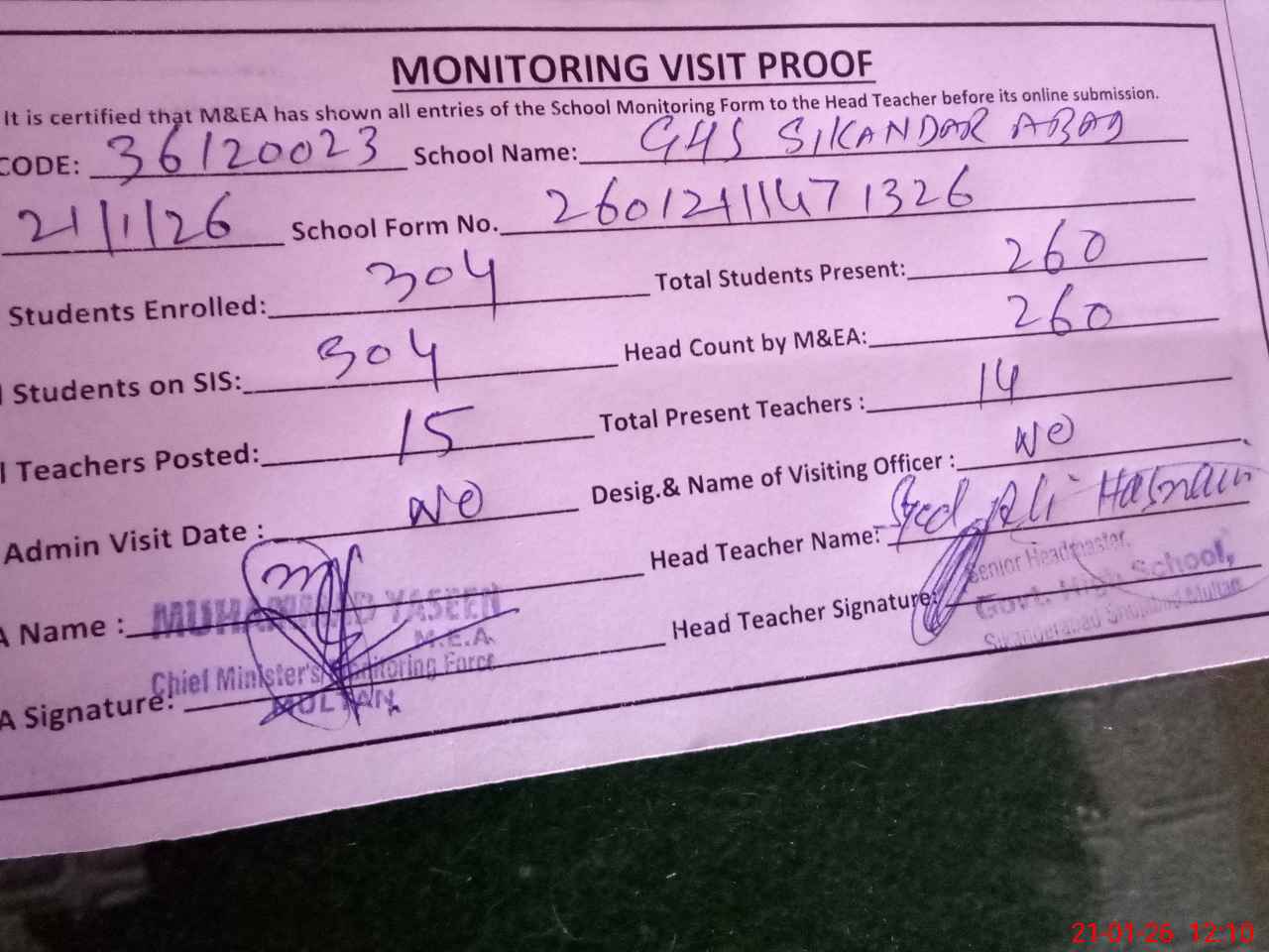 | EMIS Code: 36120023 | Name of School: GHS SIKANDER ABAD | |||