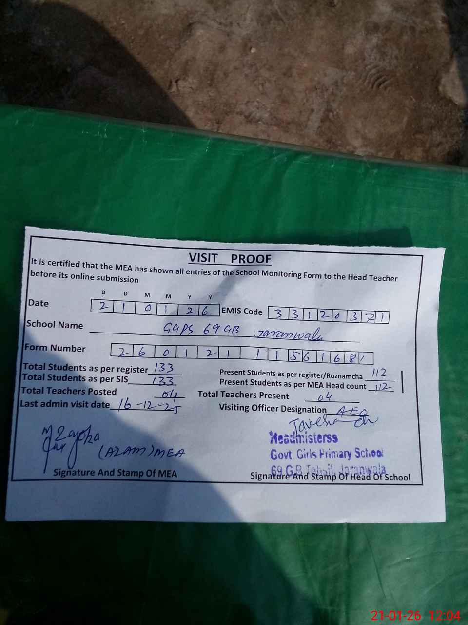 | EMIS Code: 33120371 | Name of School: GGPS CHAK 69 GB JARANWALA | |||