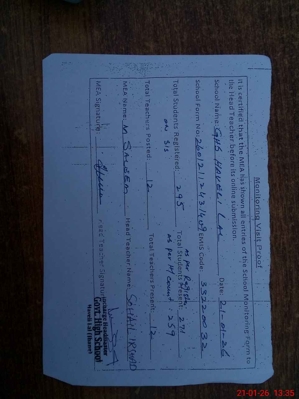 | EMIS Code: 33220032 | Name of School: GHS HAVELI LAL | |||