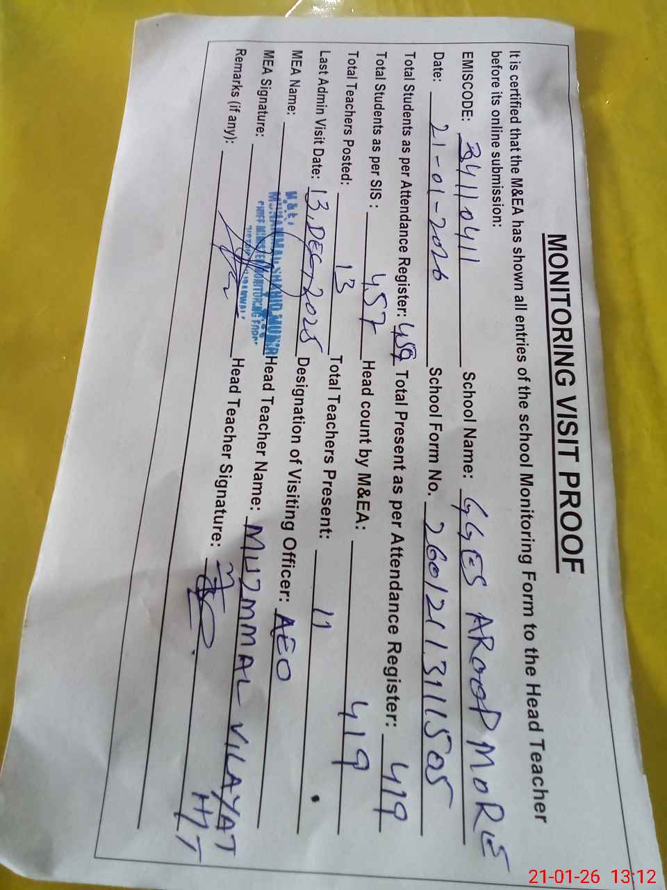 | Attendance Register | Head Teacher | MEA with School | Visit Proof |