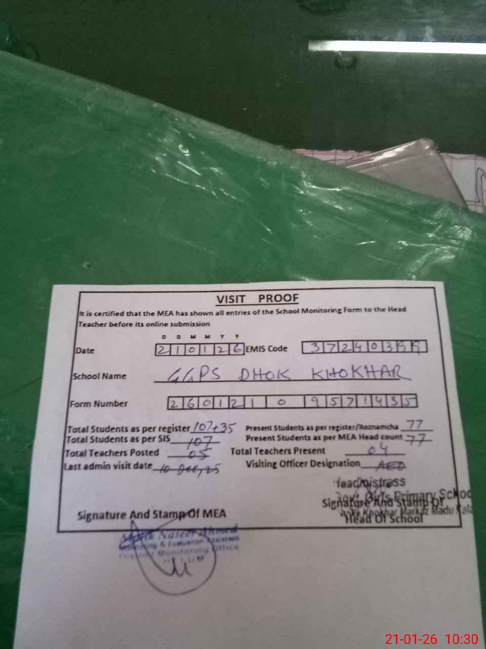 | Attendance Register | Head Teacher | MEA with School | Visit Proof |