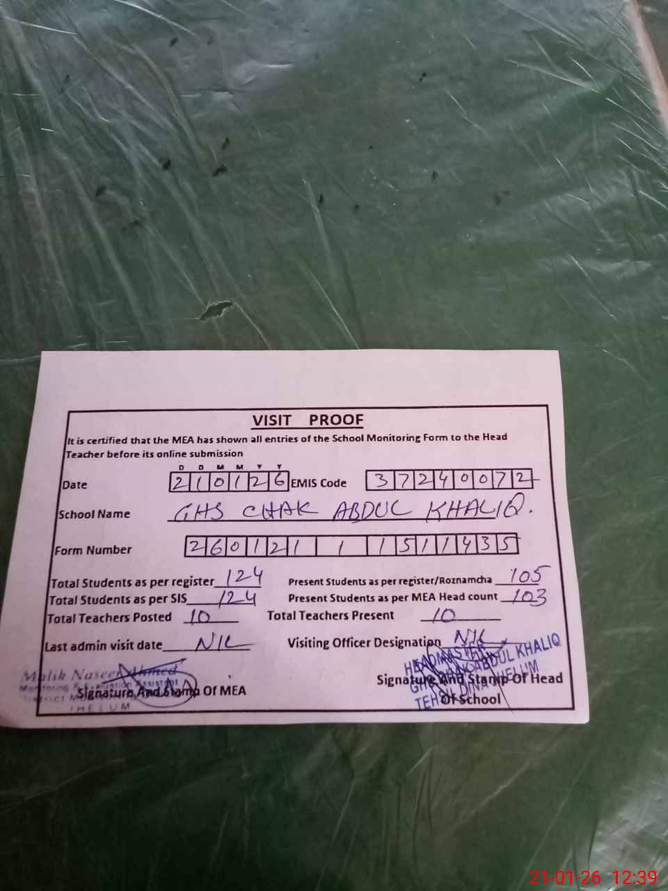 | Attendance Register | Head Teacher | MEA with School | Visit Proof |