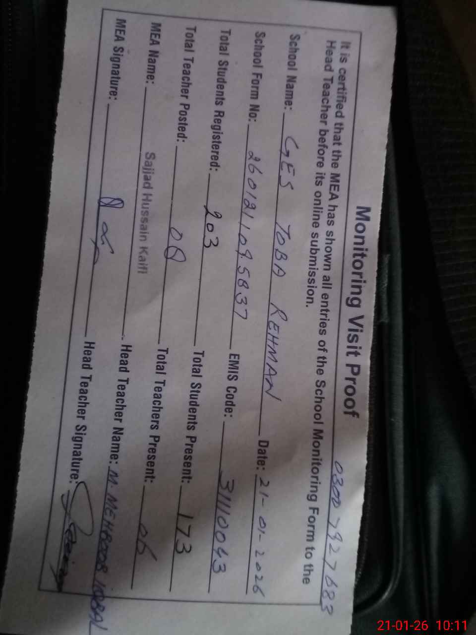 | Attendance Register | Head Teacher | MEA with School | Visit Proof |