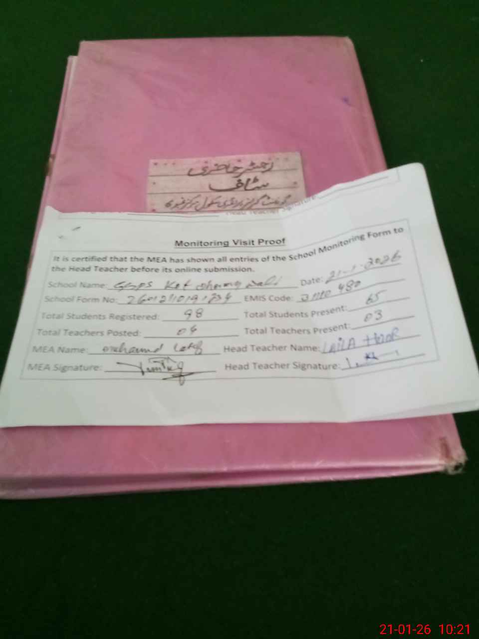 | Attendance Register | Head Teacher | MEA with School | Visit Proof |