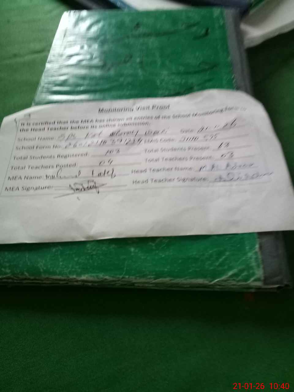 | Attendance Register | Head Teacher | MEA with School | Visit Proof |
