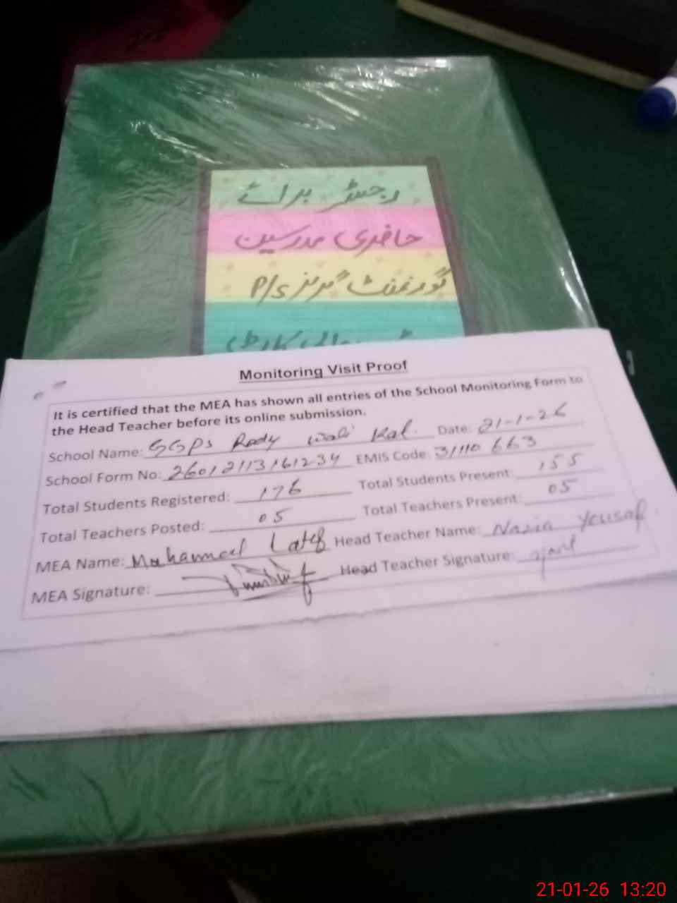| Attendance Register | Head Teacher | MEA with School | Visit Proof |