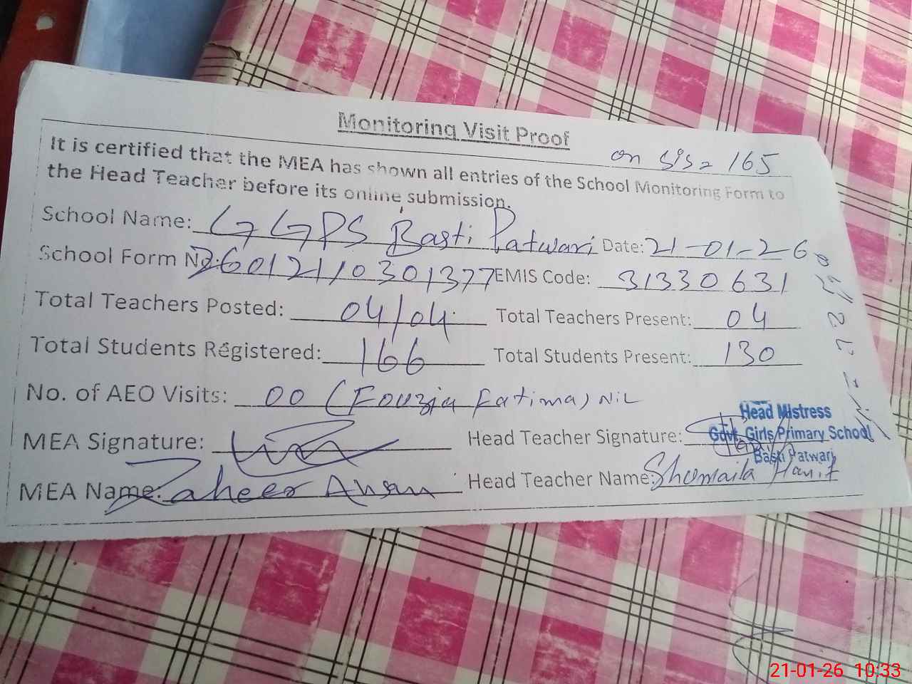 | Attendance Register | Head Teacher | MEA with School | Visit Proof |