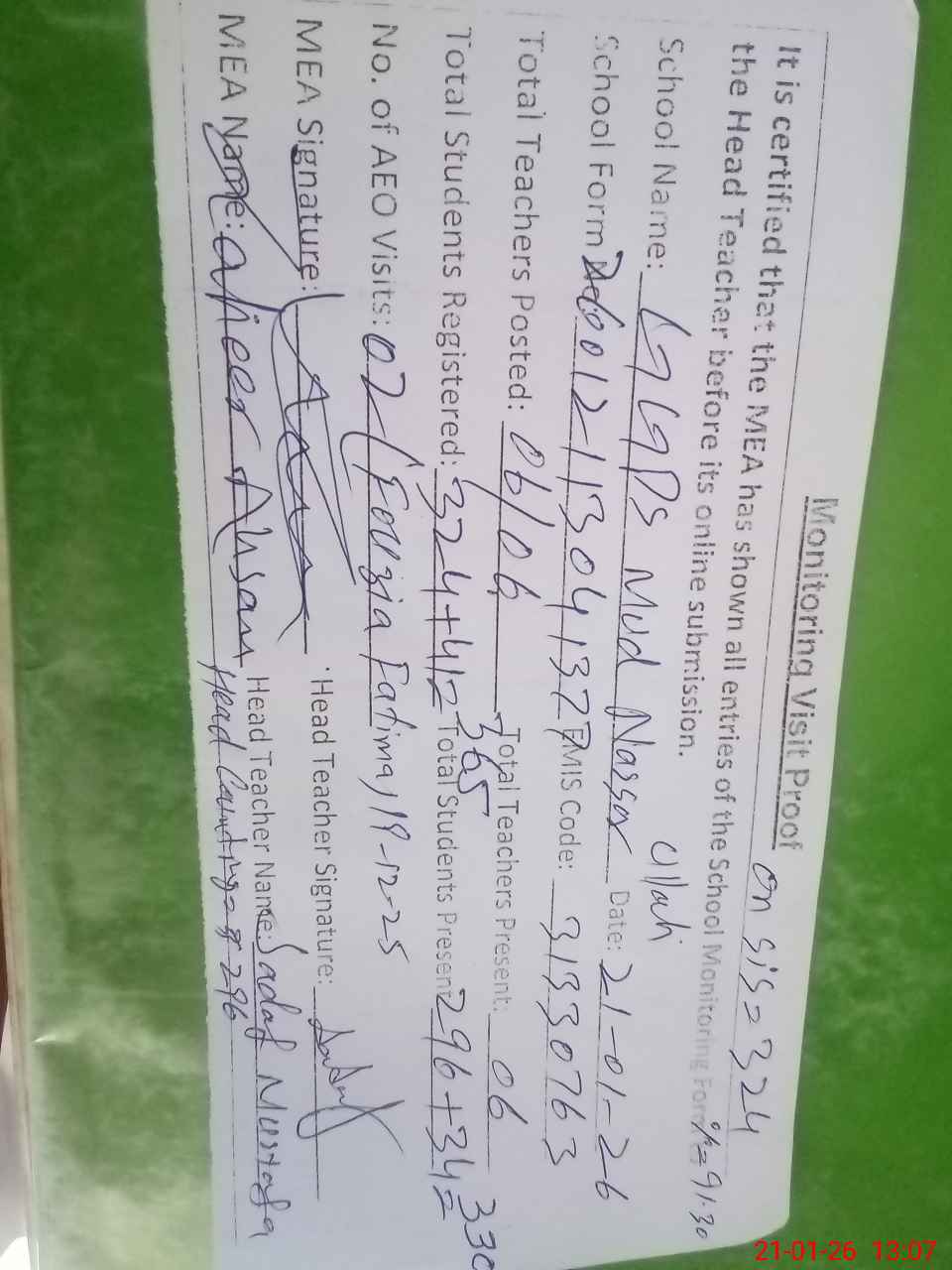 | Certified that this School was Inspected by the Undersigned MEA/DMO Today and the Information Stated Above is as Per Record. | |||||