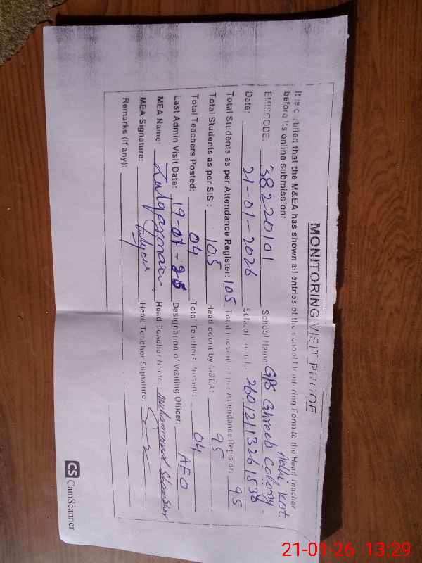 | EMIS Code: 38220101 | Name of School: GPS GHEREEB COLONY, ADHI KOT | |||