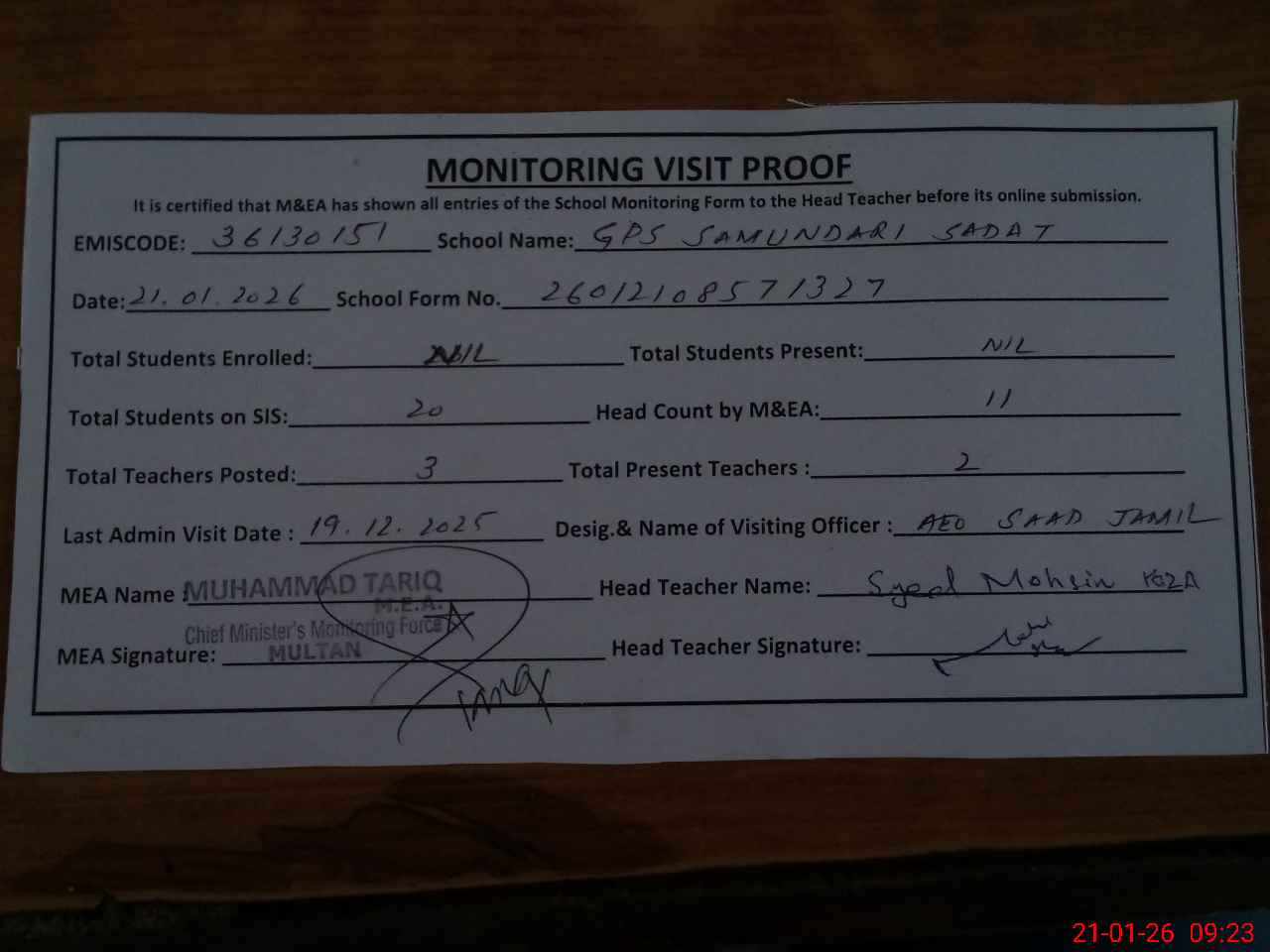 | EMIS Code: 36130151 | Name of School: GPS SAMUNDARI SADAT P/O KHANA KHAS LUTF ABAD MULTAN | |||