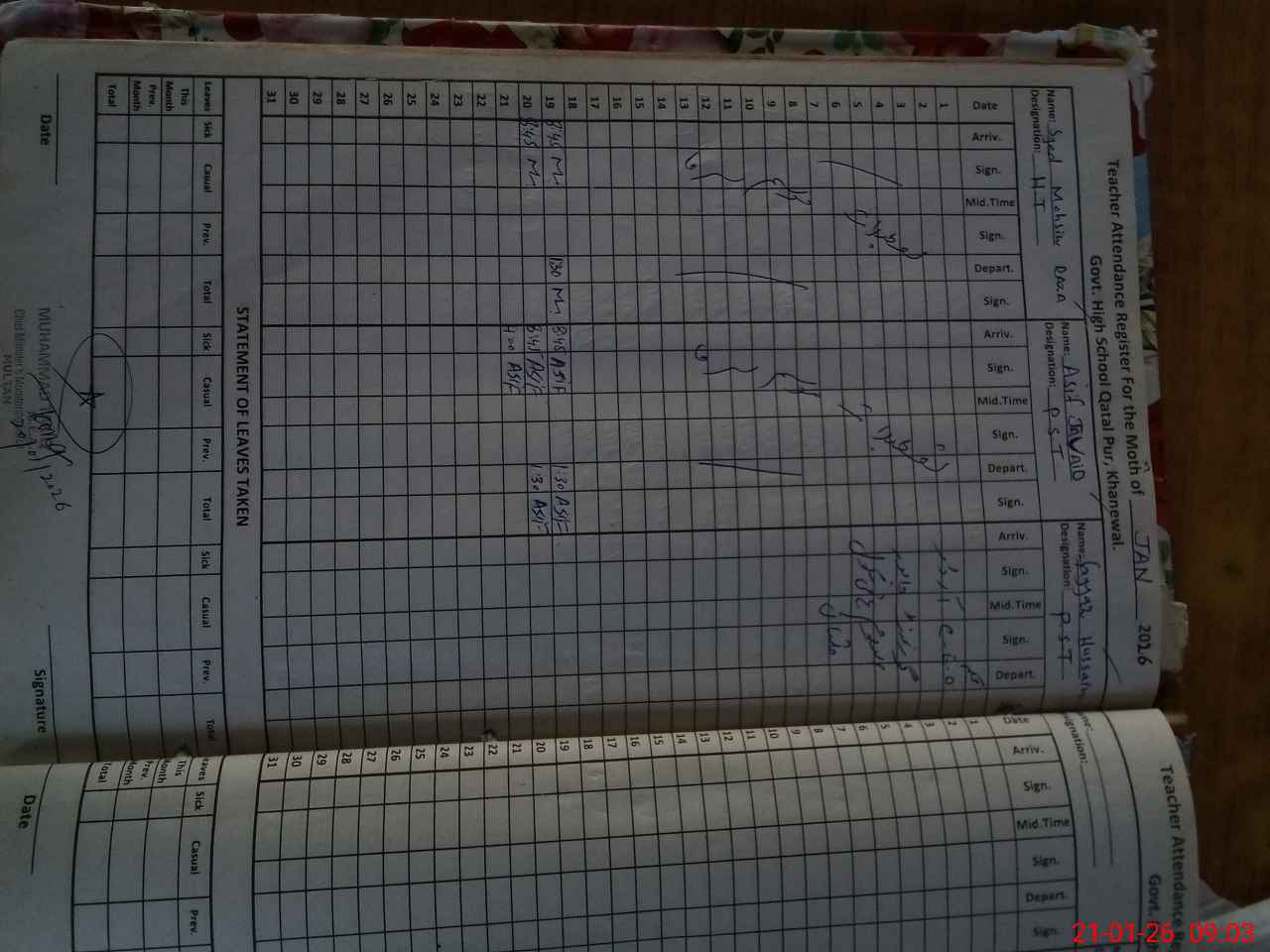 | Remarks (Use Separate Page if Required): HT SYED MOHSIN RAZA ARRIVED AT 0906 AM PST ASIF JAVAID ARRIVED AT 0900 AM PST FAYYAZ HUSSAIN MARKED ON DUTY NO VERBAL CEO ORDERS NO WRITTEN ORDERS AVAILABLE TAB NOT AVAILABLE SO STUDENTS STRENGTH COULD NOT VERIFIED FROM SIS STUDENTS ATTENDENCE NOT BEING MARKED SINCE START OF SESSION ALL STUDENTS ARRIVED AT 0914 AM NO NSB RECORDS AVAILABLE | |||||