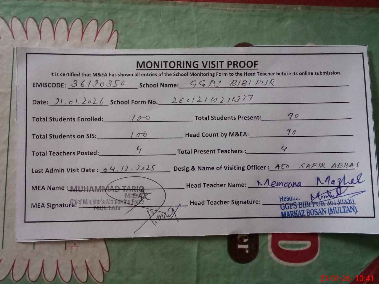 | Attendance Register | Head Teacher | MEA with School | Visit Proof |