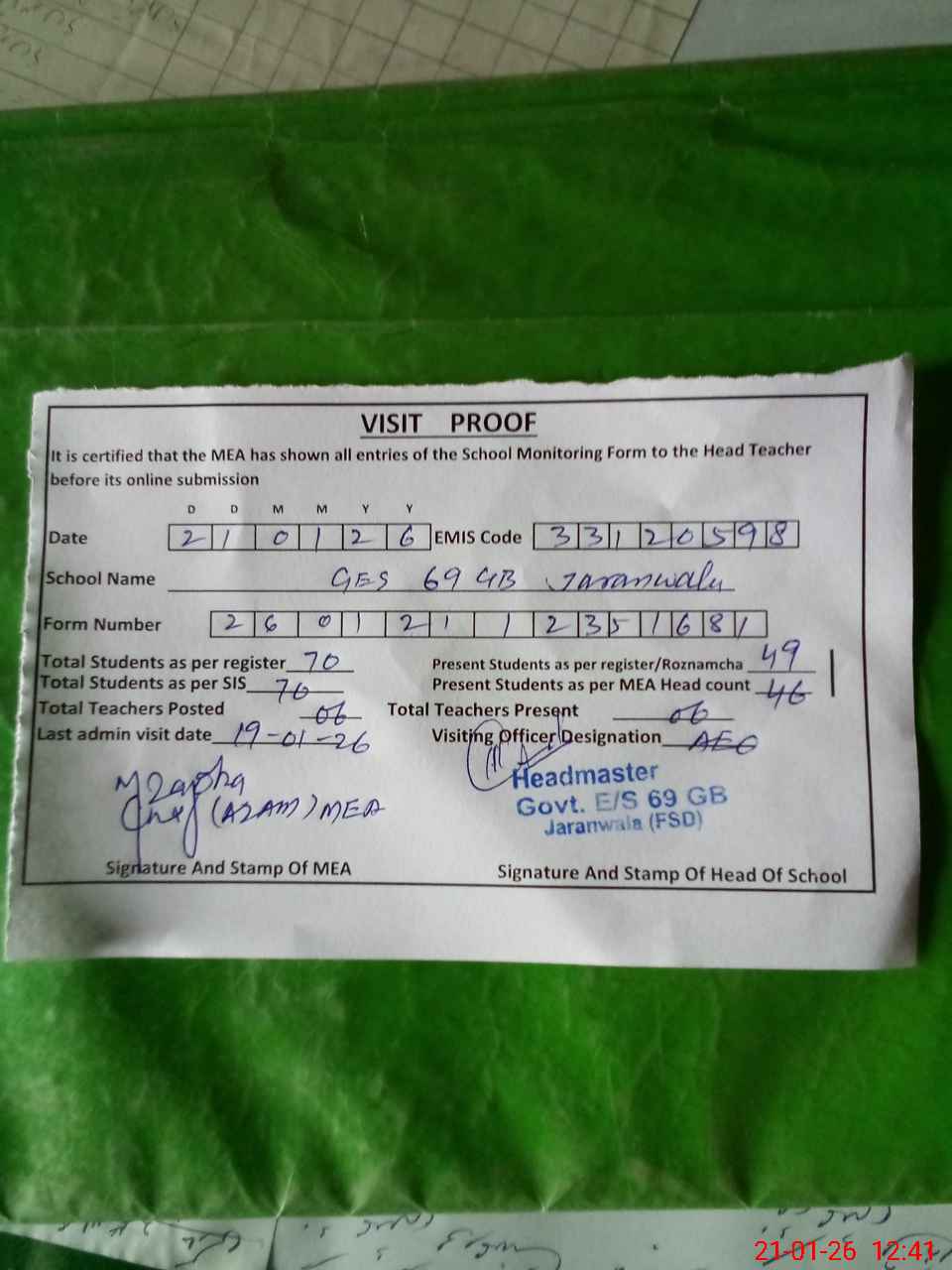 | Attendance Register | Head Teacher | MEA with School | Visit Proof |