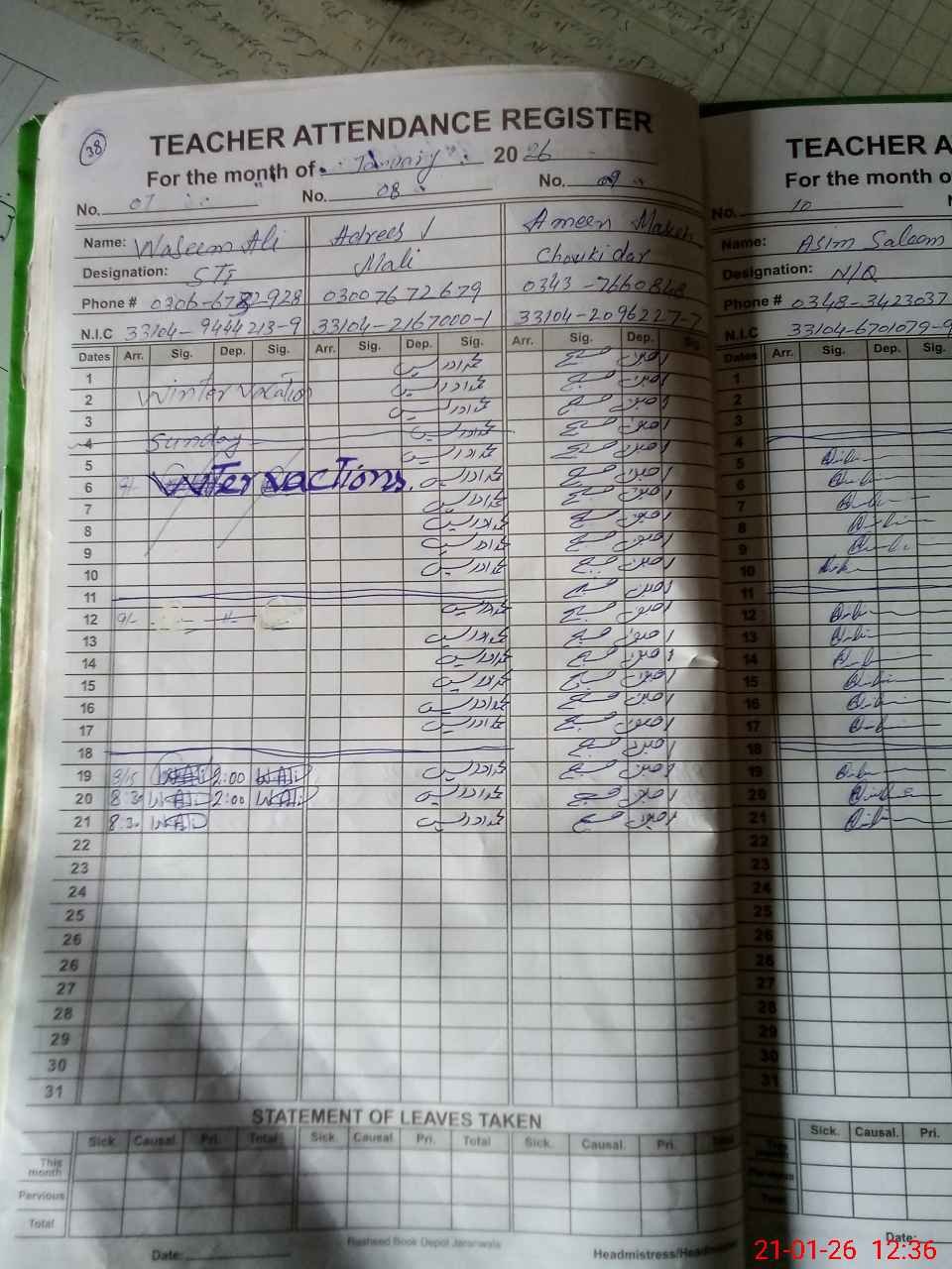 | CNIC | Full Name | Designation | R/C | Absence During Last Calender Month |