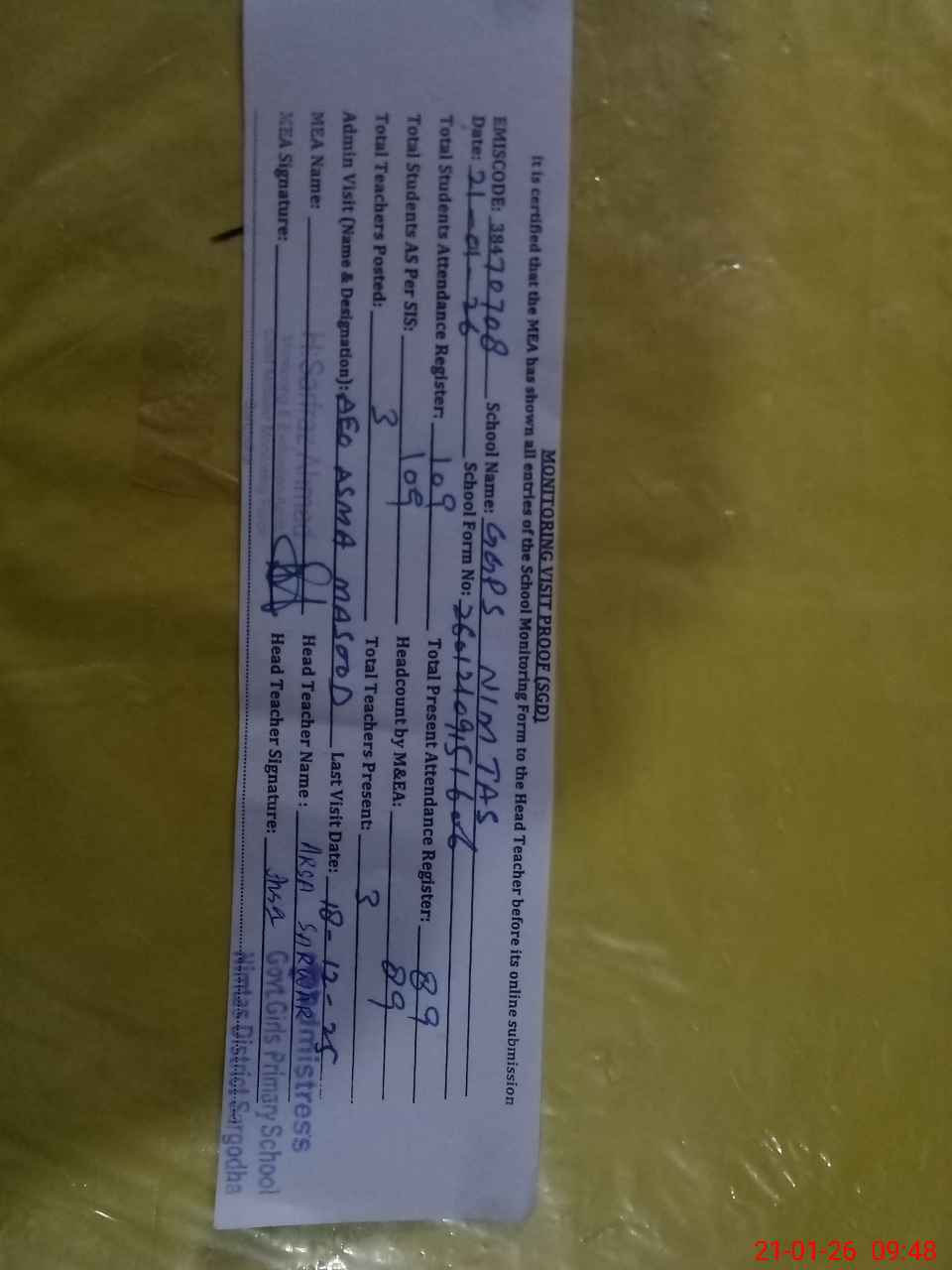 | Attendance Register | Head Teacher | MEA with School | Visit Proof |