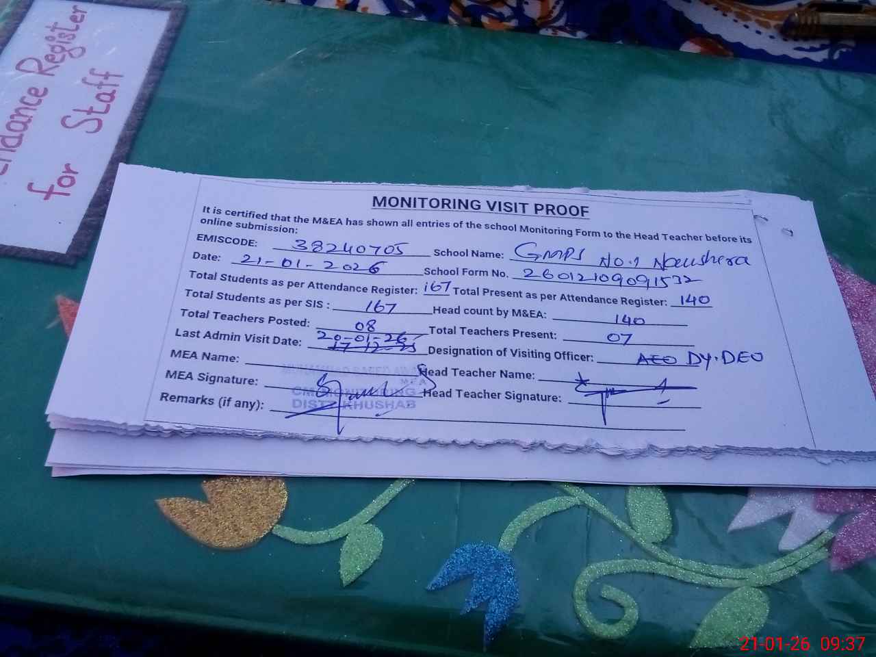 | Remarks (Use Separate Page if Required): Students on SIS Qty 167 Last admin visit On 20 January 2026 by Dy.DEO | |||||