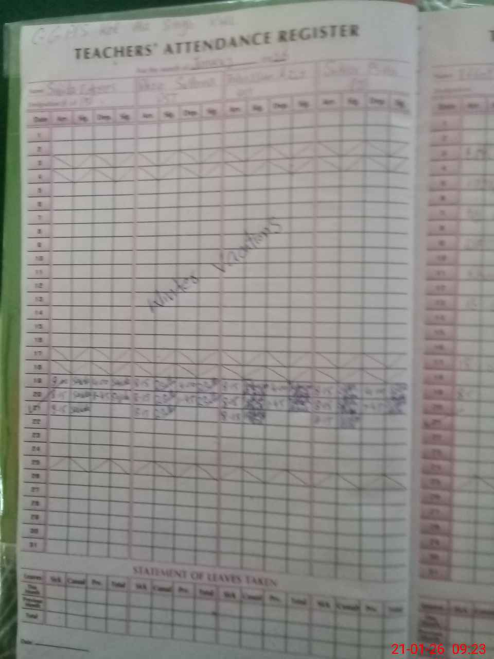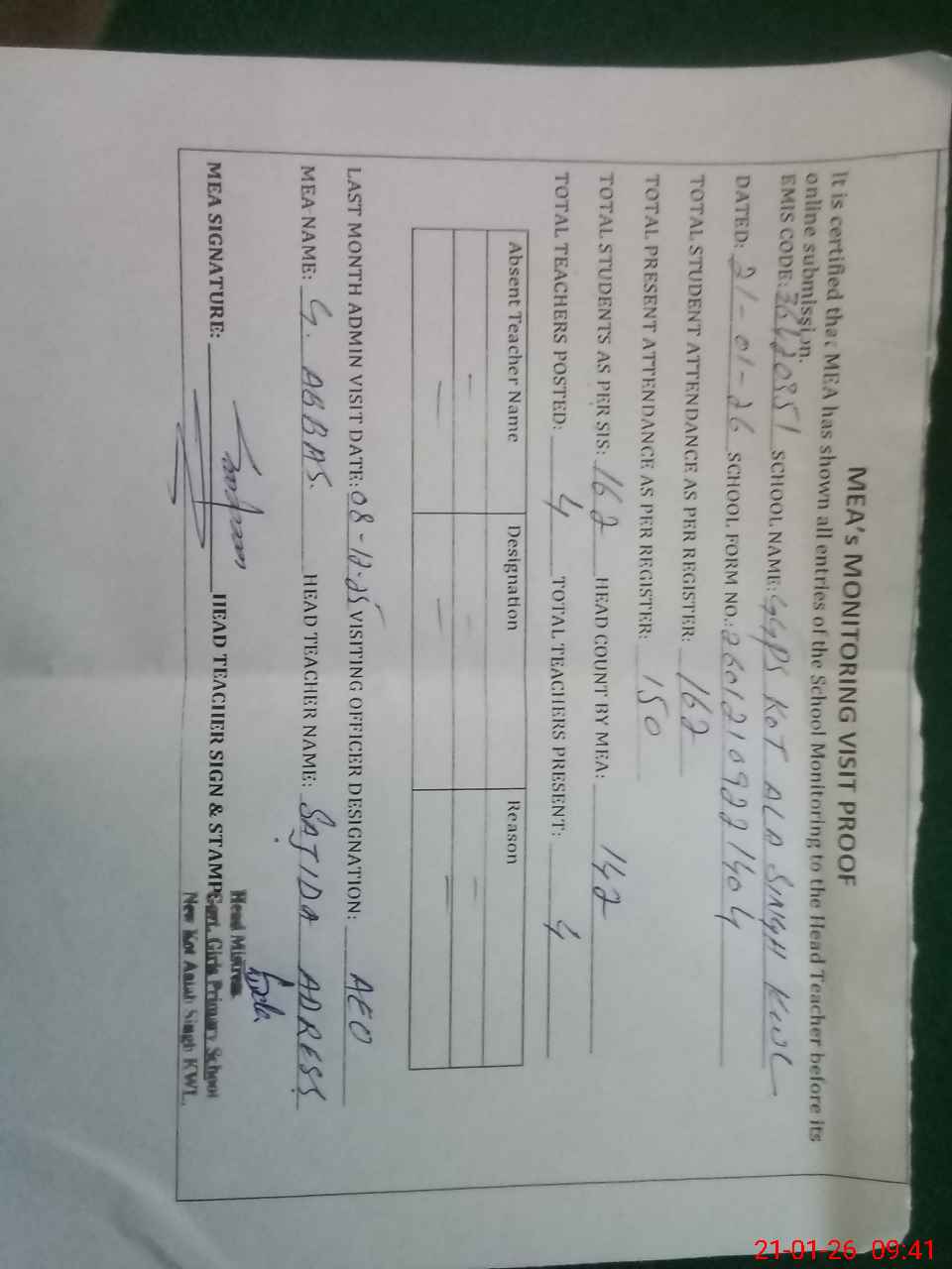 | Attendance Register | Head Teacher | MEA with School | Visit Proof |