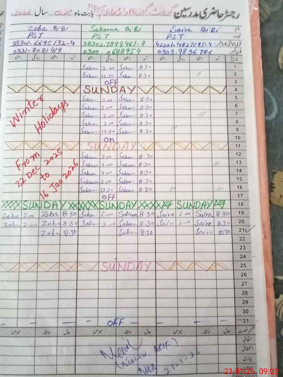 | CNIC | Full Name | Designation | R/C | Absence During Last Calender Month |