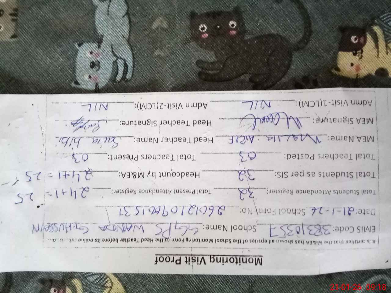 | Attendance Register | Head Teacher | MEA with School | Visit Proof |