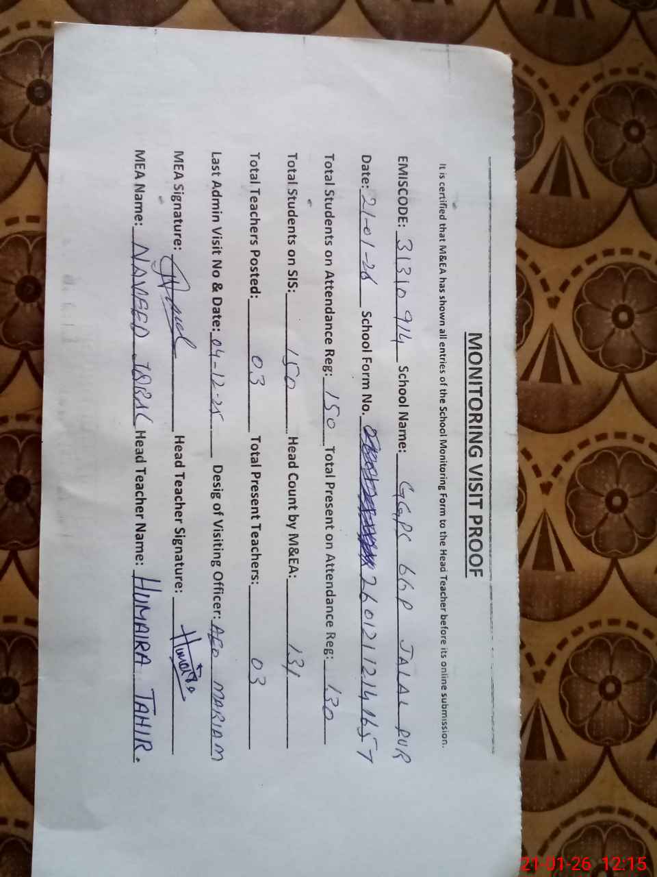 | Attendance Register | Head Teacher | MEA with School | Visit Proof |