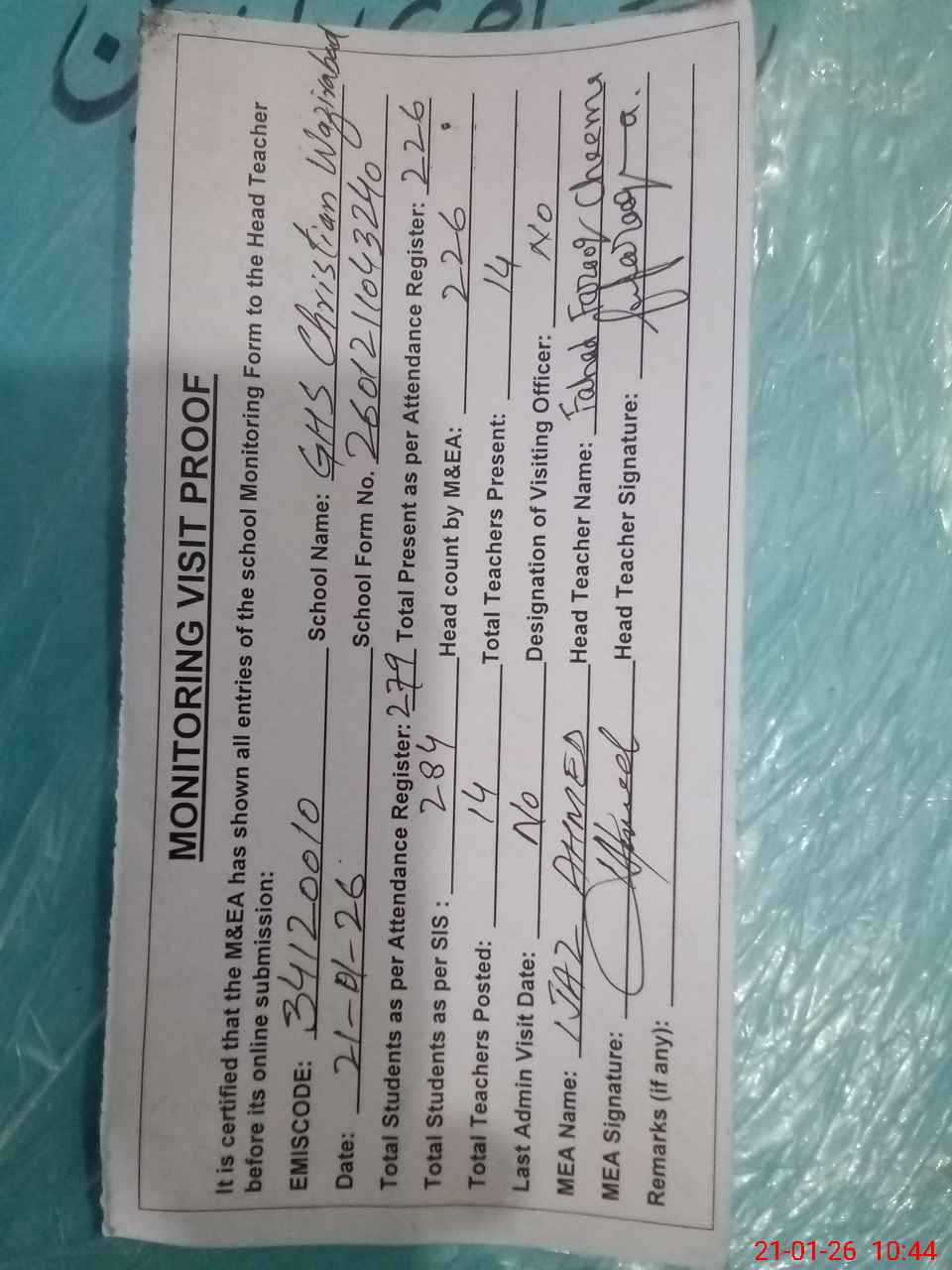 | EMIS Code: 34120010 | Name of School: GHS CHRISTIAN WAZIRABAD | |||
