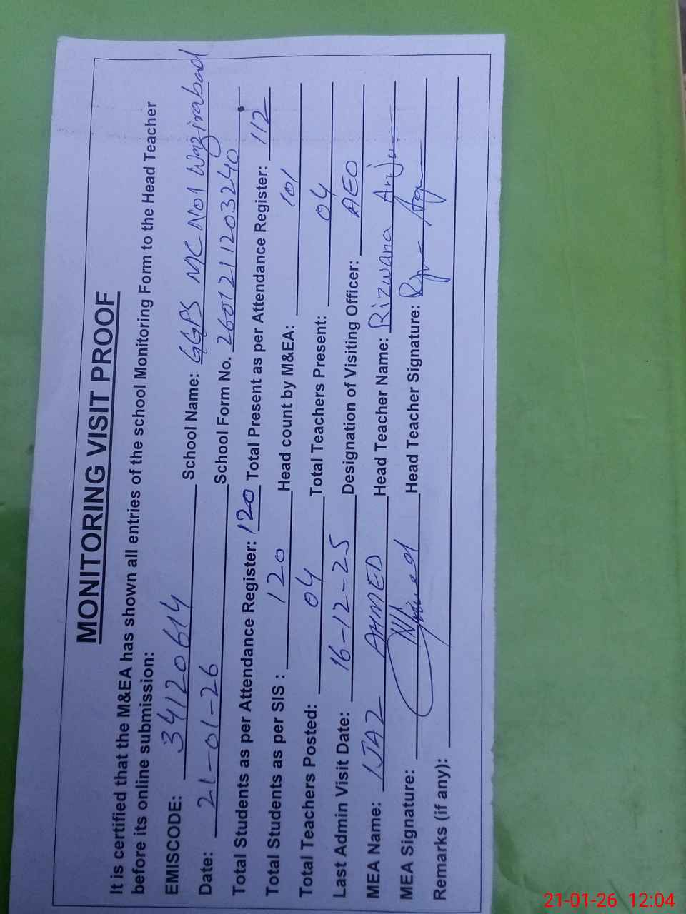 | Attendance Register | Head Teacher | MEA with School | Visit Proof |