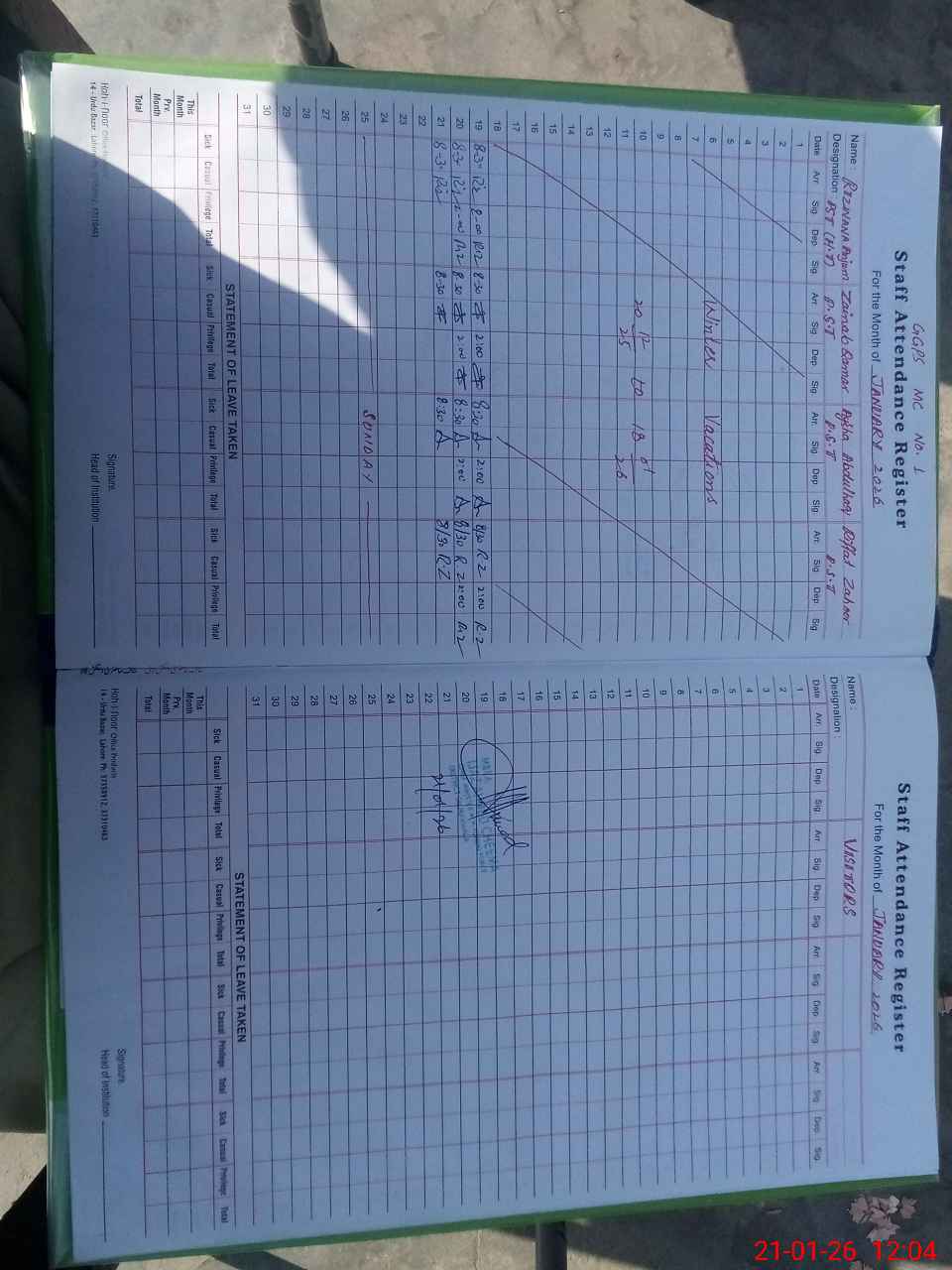 | Leave | Duty | Absent | Maternity | Medical | Ex- Pak |