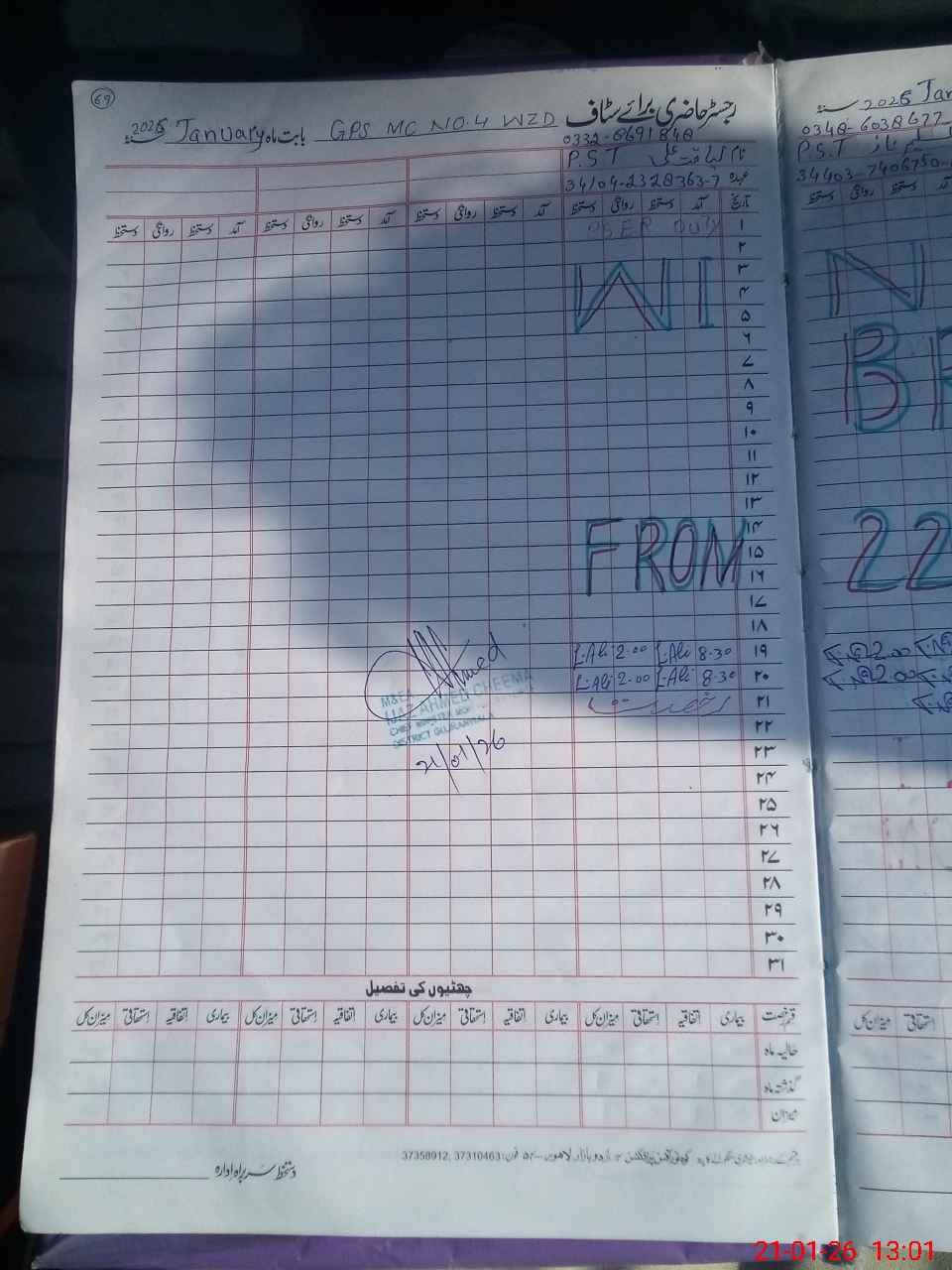 | CNIC | Full Name | Designation | R/C | Absence During Last Calender Month |