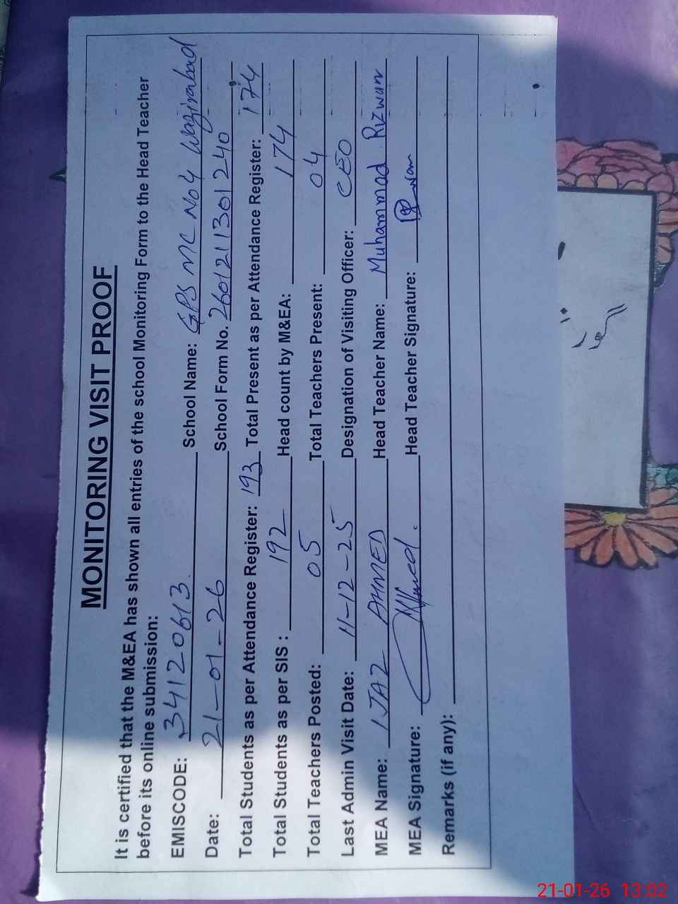 | Attendance Register | Head Teacher | MEA with School | Visit Proof |