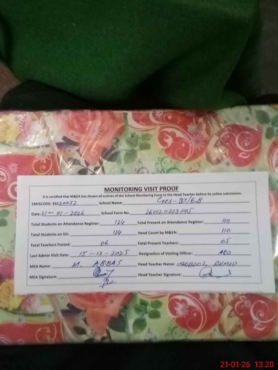 | Attendance Register | Head Teacher | MEA with School | Visit Proof |