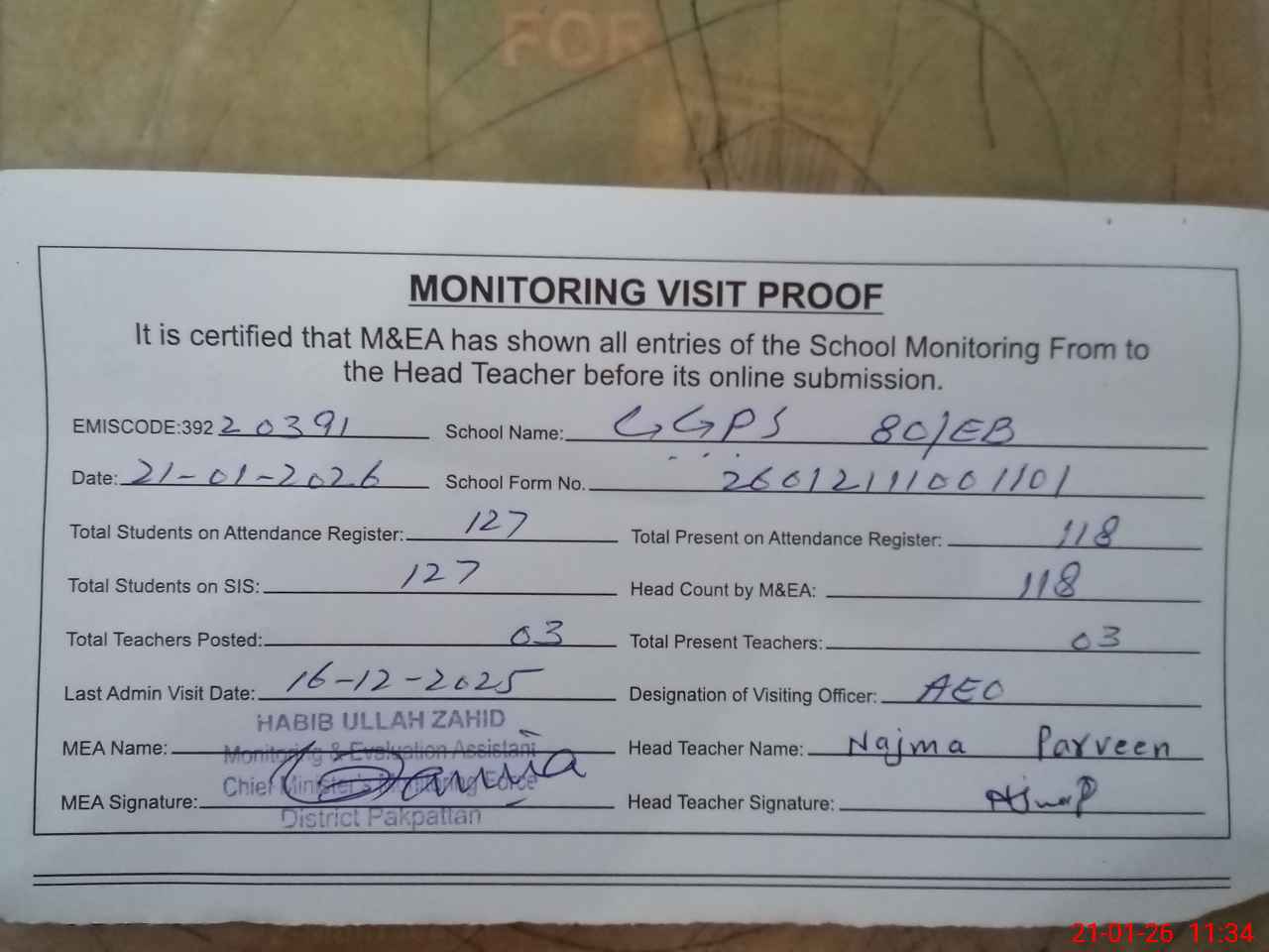 | Attendance Register | Head Teacher | MEA with School | Visit Proof |