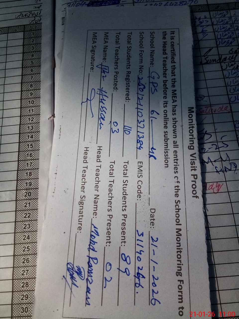 | EMIS Code: 31140246 | Name of School: GPS CHAK NO.61/4-R | |||