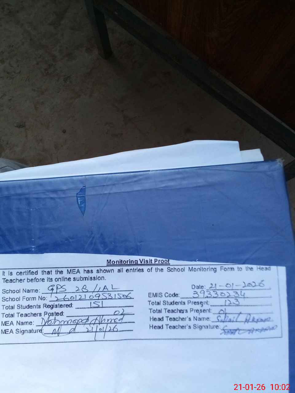 | Attendance Register | Head Teacher | MEA with School | Visit Proof |