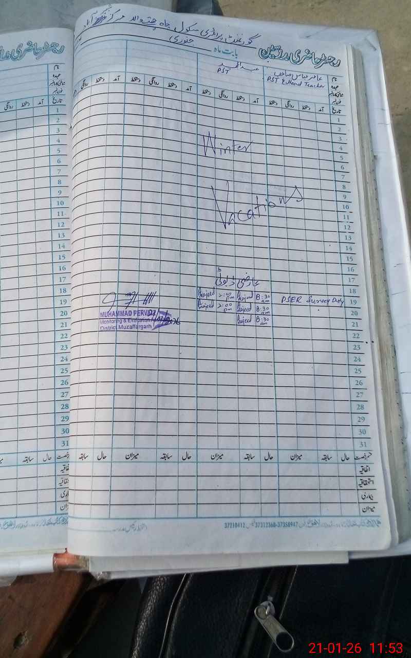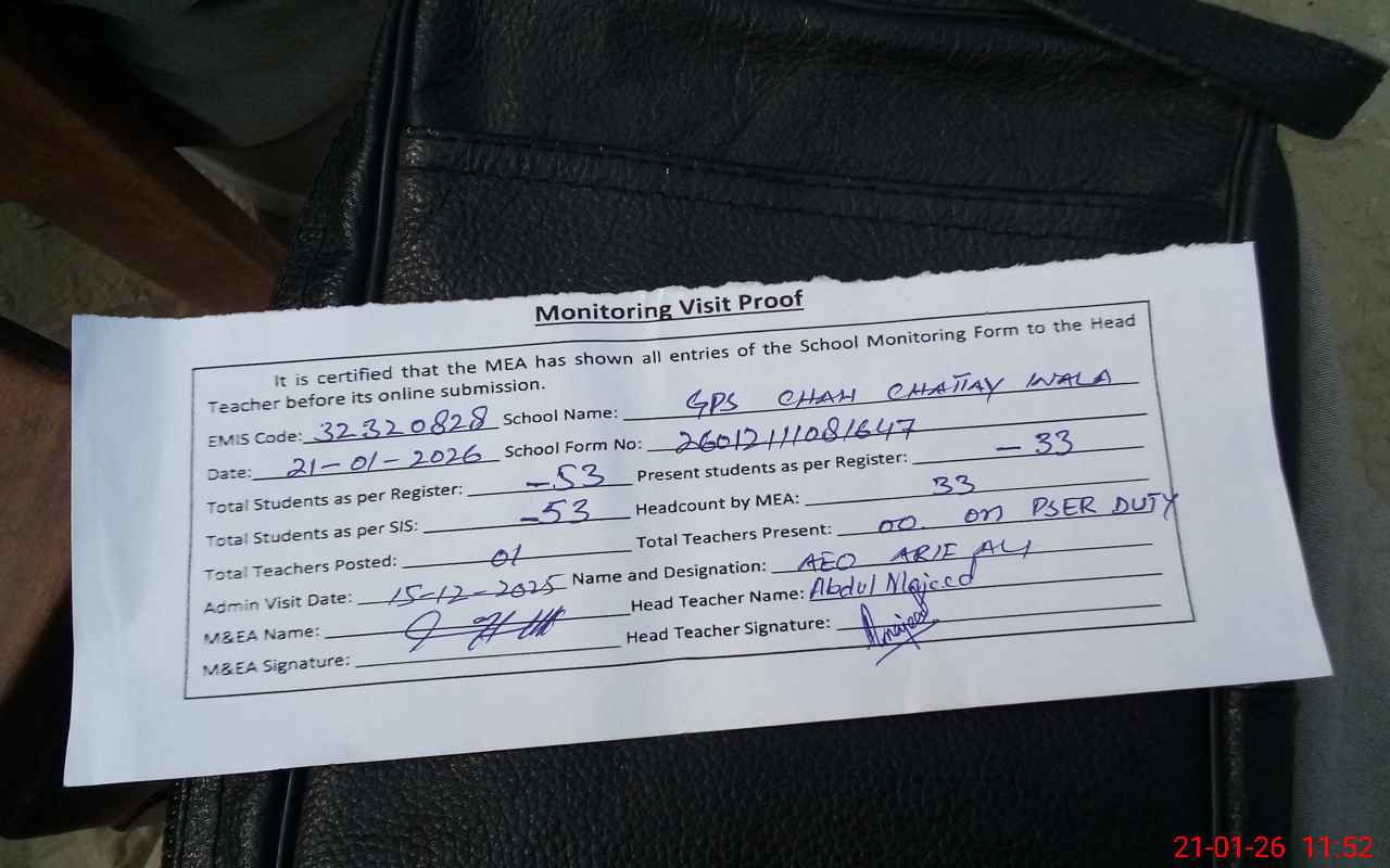 | Remarks (Use Separate Page if Required): Only 01 teacher (Aamir Abbas) held on posting strength of this school. He is on PSER duty since October, 2025. Teacher Abdul Majeed from GPS Langri Wala present in the school during visit but no school data held with him. | |||||