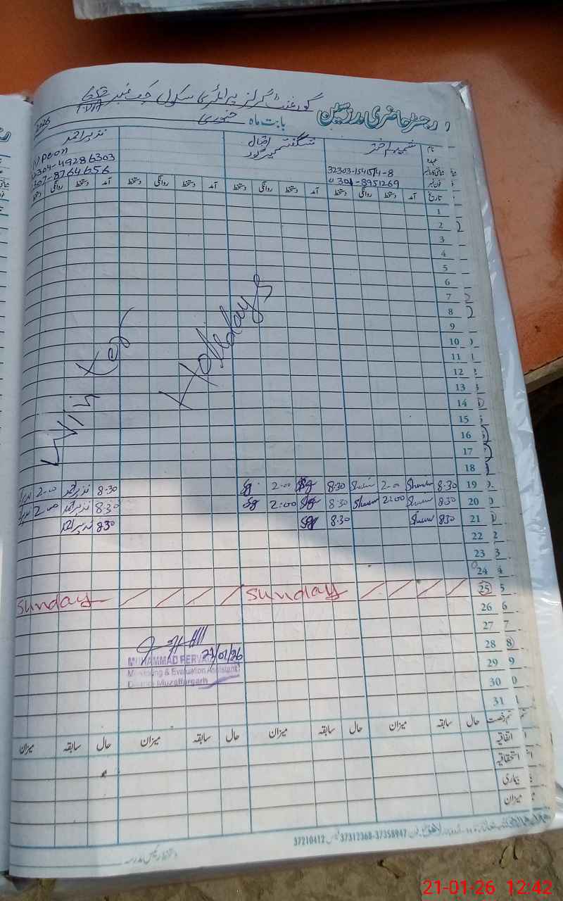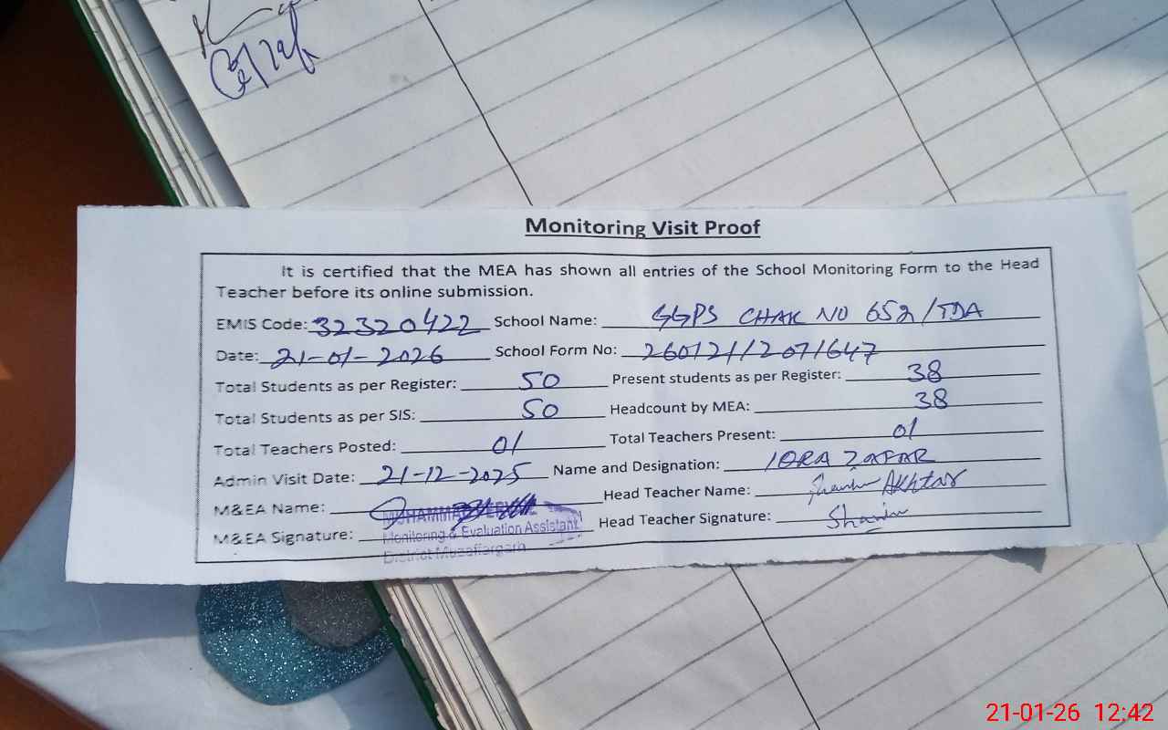 | Remarks (Use Separate Page if Required): 03 teachers (Rabia Kanwal, Ruqia Nawaz and Rehana Kethrin) were transferred from this school on 28 November, 2025 in a signal day. Head teacher Shamim Akhtar ( PST Matric ) facing lot of problems for remains functioning of this school due to a single teacher and not a good familiar to electronic gadgets. | |||||
