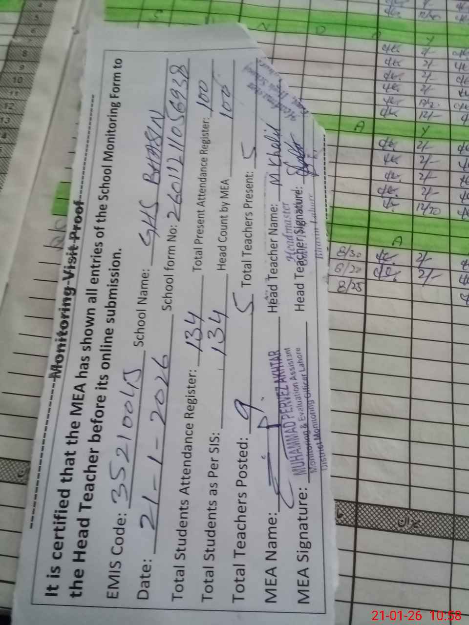| Attendance Register | Head Teacher | MEA with School | Visit Proof |