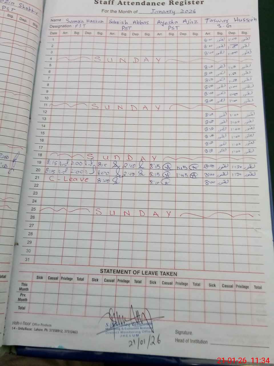 | CNIC | Full Name | Designation | R/C | Absence During Last Calender Month |