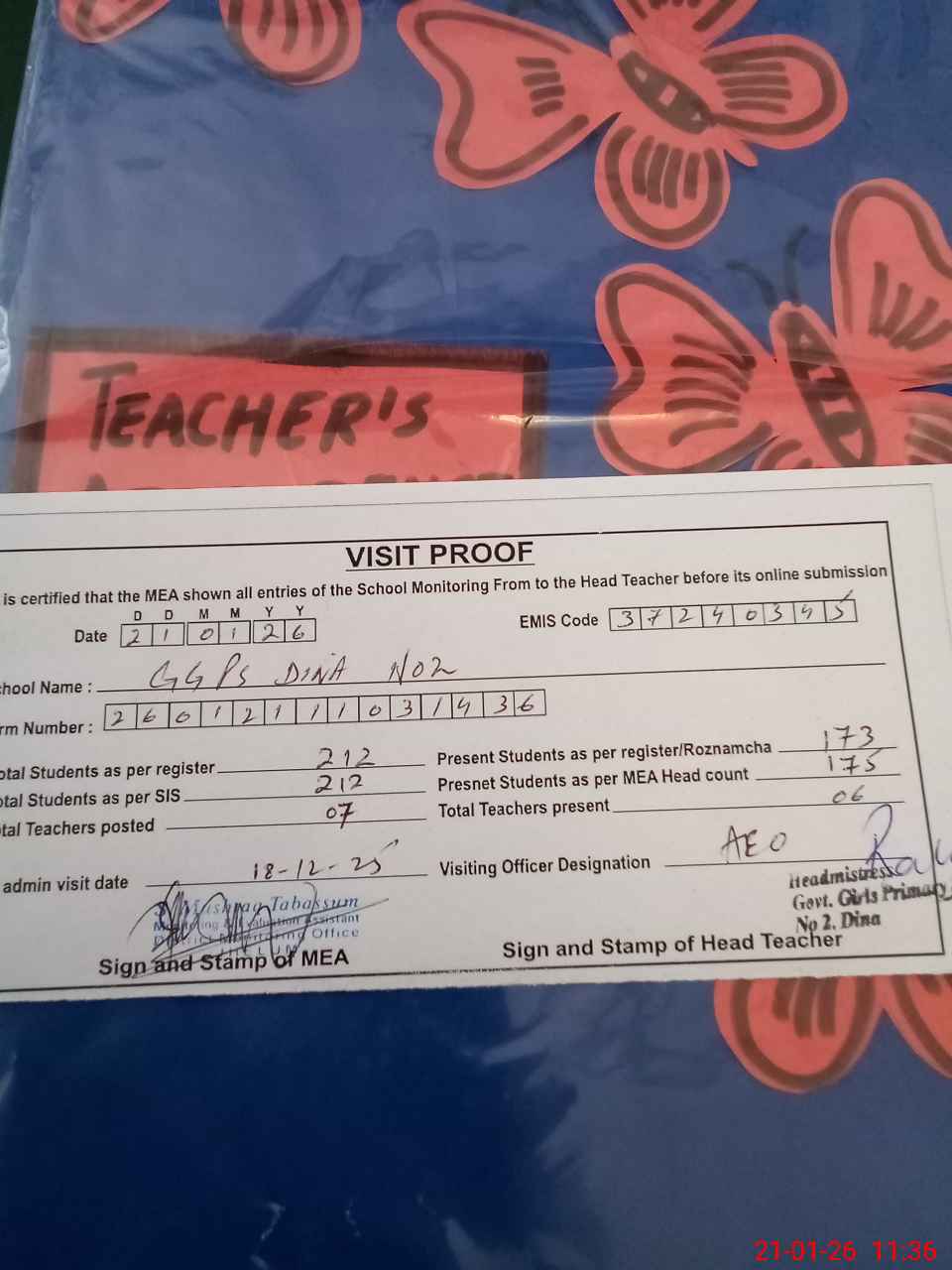 | Attendance Register | Head Teacher | MEA with School | Visit Proof |