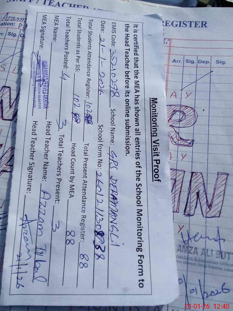 | Attendance Register | Head Teacher | MEA with School | Visit Proof |