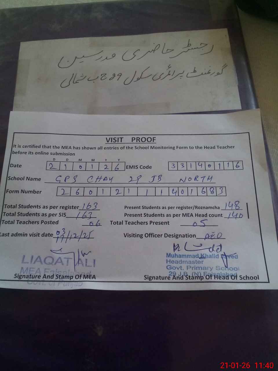 | Attendance Register | Head Teacher | MEA with School | Visit Proof |