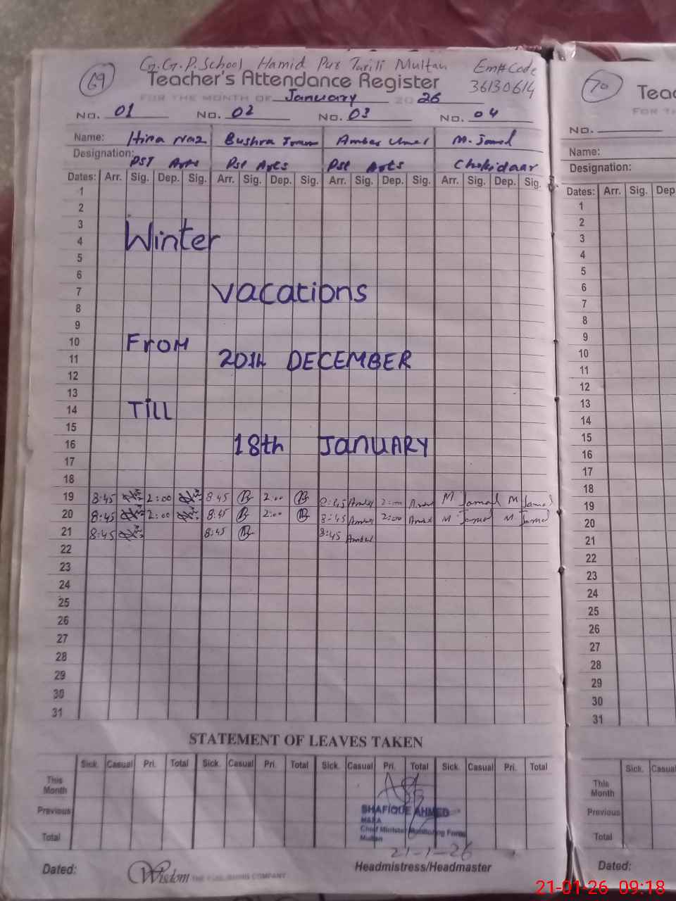 | Name: Hi**** Na**** Designation: (School Headmaster's/Headmistress's) Headmistress Phone/Cell Number: 03**** |