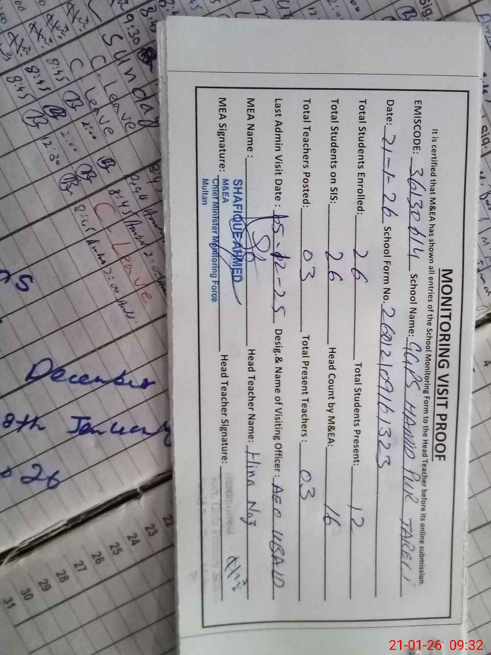 | EMIS Code: 36130614 | Name of School: GGPS HAMID PUR TARELI MULTAN | |||