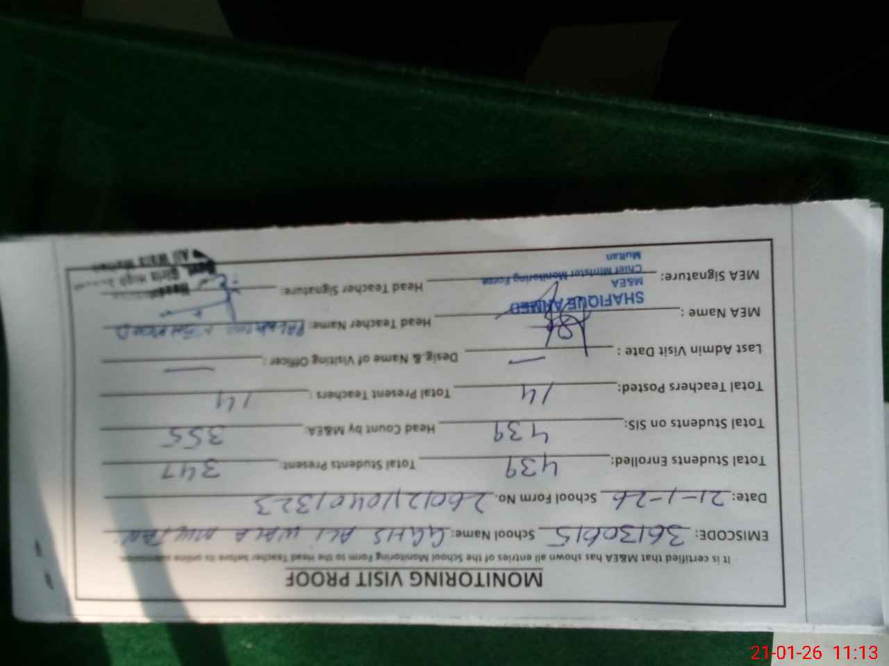 | Certified that this School was Inspected by the Undersigned MEA/DMO Today and the Information Stated Above is as Per Record. | |||||